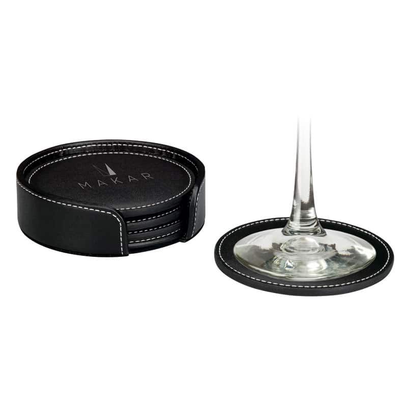 Black bonded leather 4 coaster set with white contrast stitching and matching holder. Unit price includes decoration on all 4 coasters. Complies with Prop 65. 4 1/4″ W x 4 1/4″ H x 1 1/2″ D