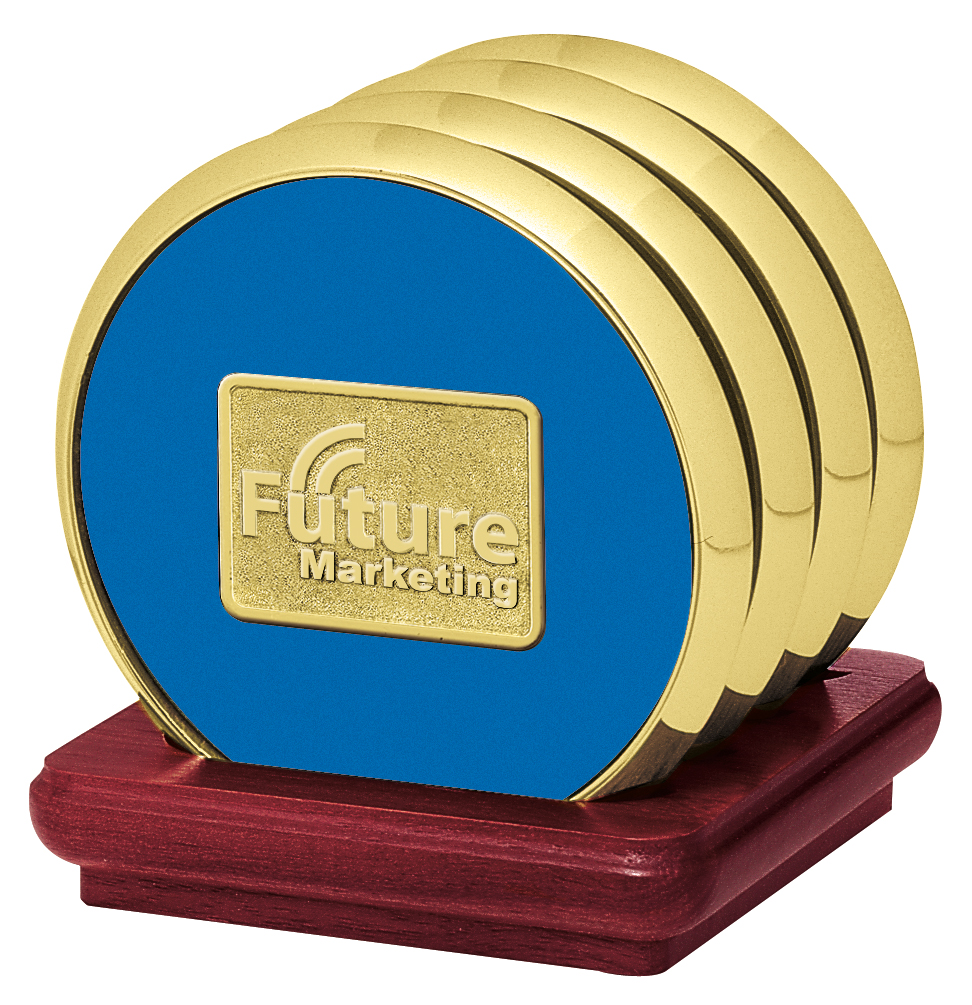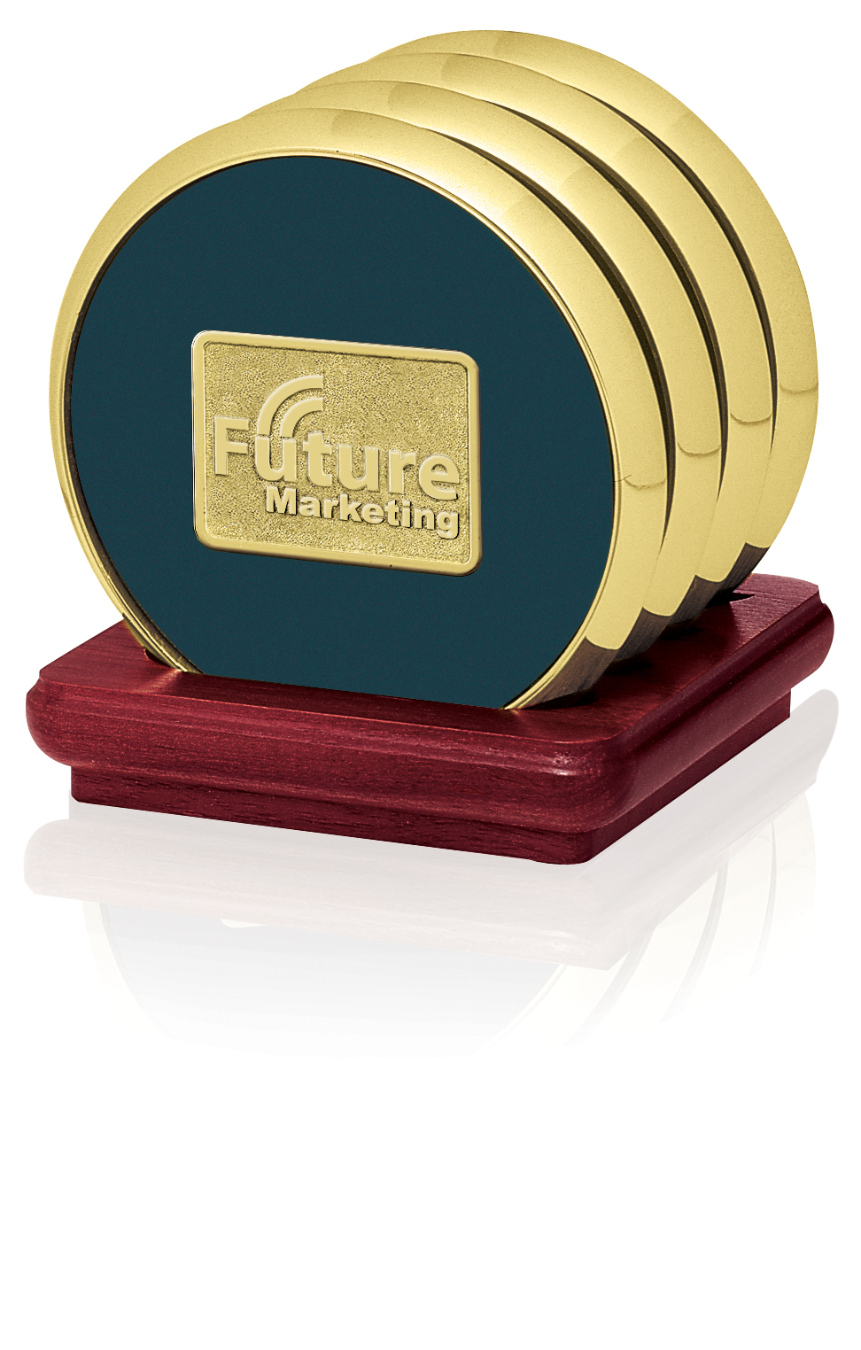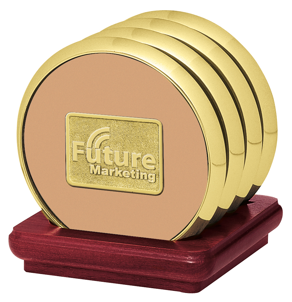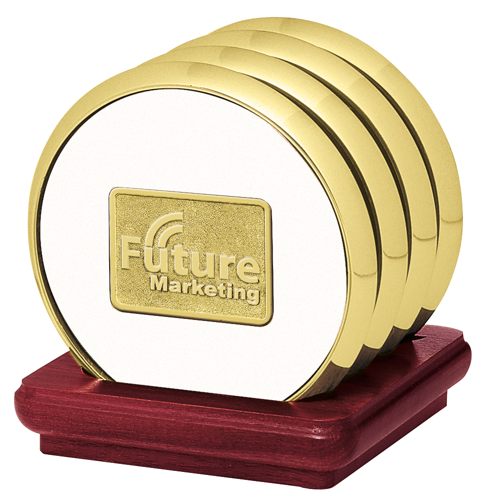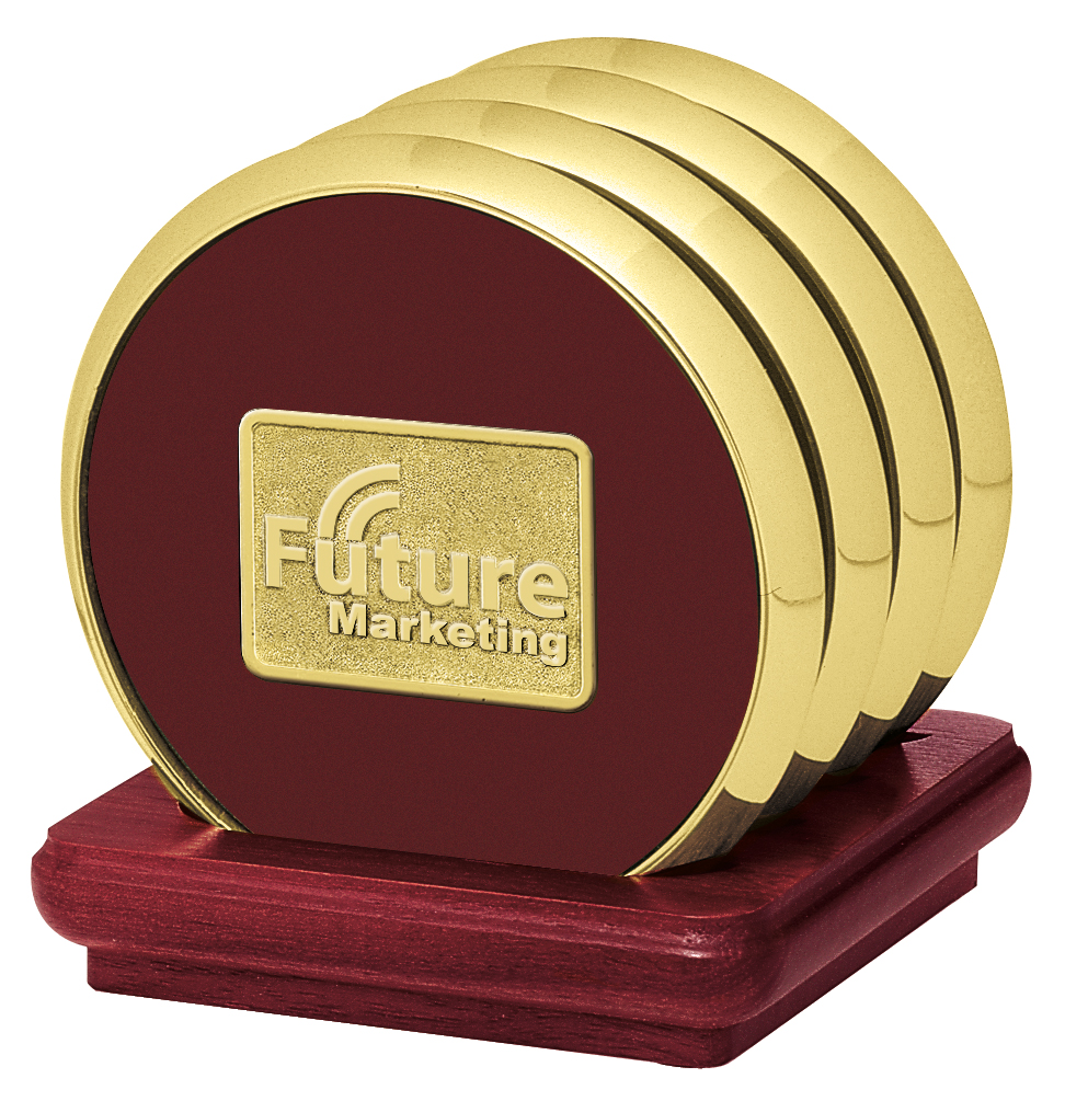This stunning four coaster set stands tall in a solid cherry wood base. Coaster finish is molded zinc (silver) or brass-plated zinc (shown). Bonded leather is urethane coated to resist staining and cork backed to protect furniture. Complies with Prop 65. 3.625″ W x 4″ H x 3.625″ D