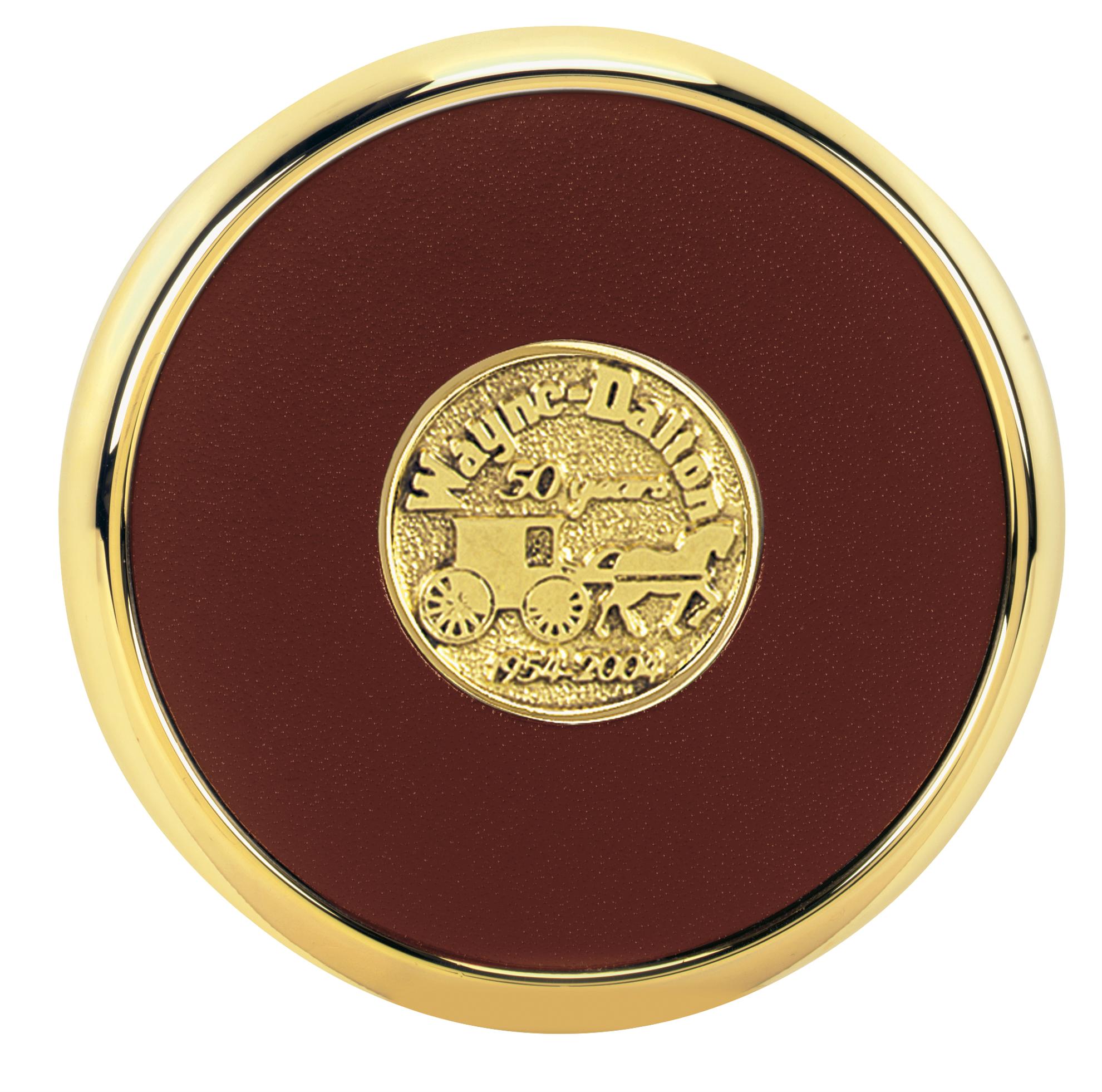 Made of brass-plated zinc these bonded leather coasters make a great gift. Leather is urethane coated to resist staining and cork backed to protect furniture. Also available in brushed-zinc (25036) and shiny-zinc (25039). Complies with Prop 65. 3.75″ Diameter x 0.375″ H