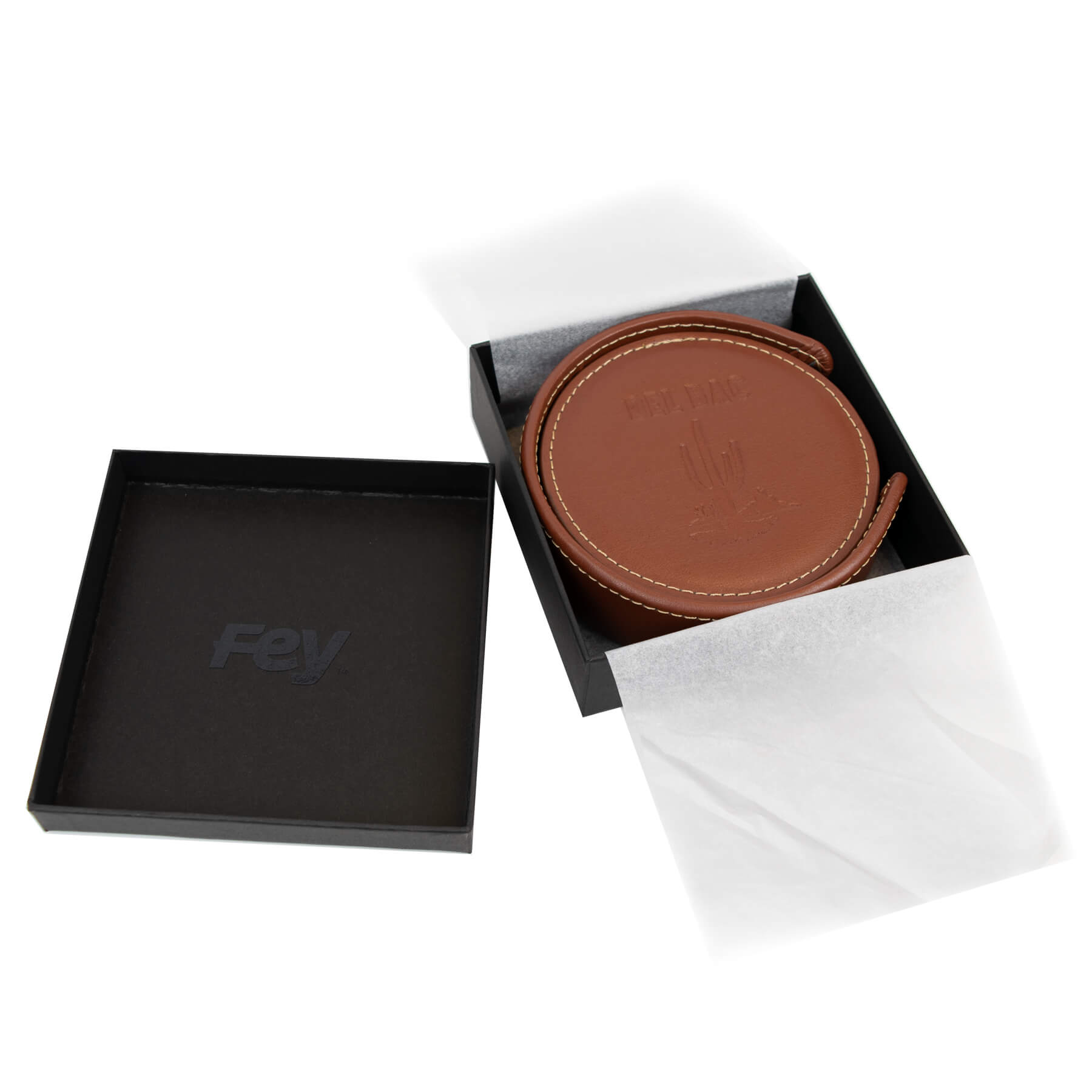 Long lasting and classy…The leather coaster gift set is simply a staple business promotional item that has stood the test of time. Great give-away item for trade shows or sales calls and also for executive gift giving. This item will surely be used. Comes in a gift box. Coaster holder matches coaster color. Complies with Prop 65. 4.37″ H x 4.37″ W x 1.25″ D