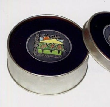 Leather Coasters Tin w/ 4 comes in brown and black. Silver tin, Club Lorente Medallion. 3 1/2″ Diameter x 1.5″ H