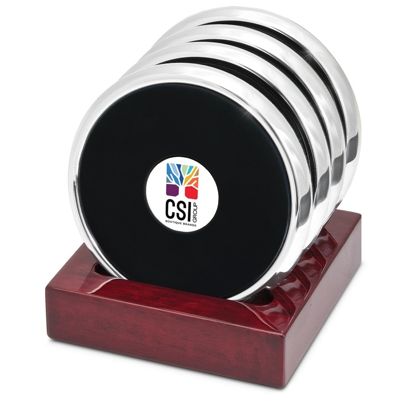 Enhance your corporate branding with this Set of Four Coasters, featuring polished silver-tone leather and a rosewood finish stand. Perfect for customization with an engravable plate. Comes in a gift box. D3 Color Medallion included for distinguished presentation. Ideal for bulk orders and promotional events. 5″ L x 5″ W x 4″ H