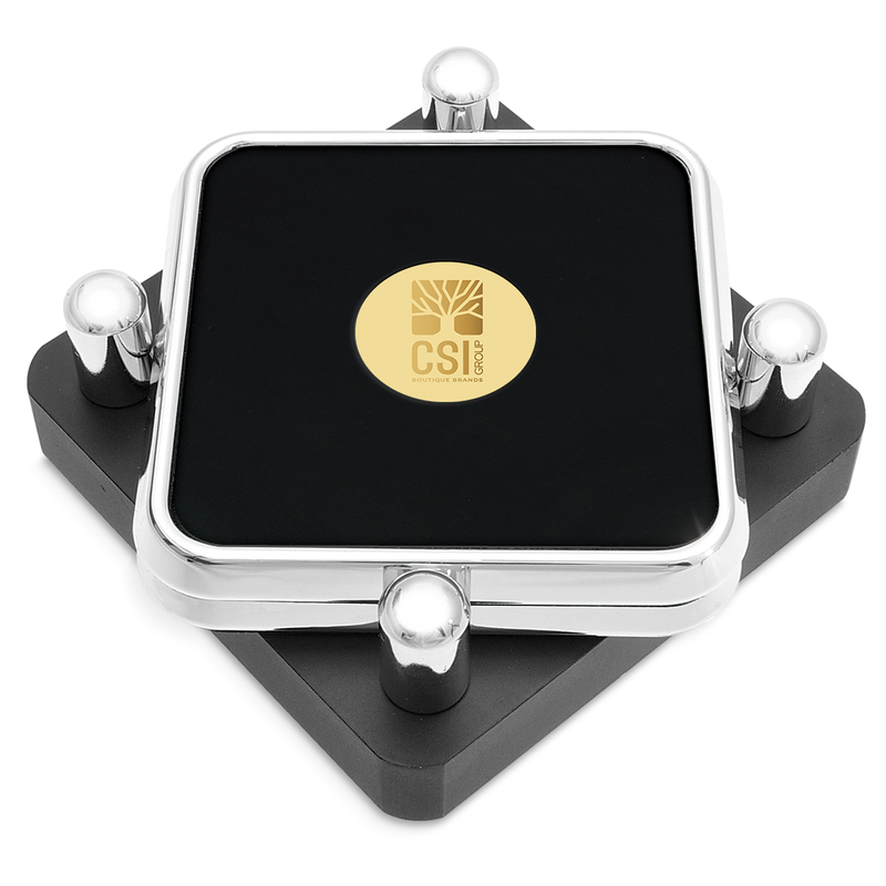 Enhance your corporate gifting with our Set of Two Square Coasters in Silver. This set features polished silver-tone and leather coasters, housed in a sleek black wooden base with chrome-plated posts. D3 Medallion. Dimensions: 4-1/4 x 4-1/4 x 1-1/2 inches. Comes in a gift box. 2.75″ H x 5.25″ W x 5.25″ L