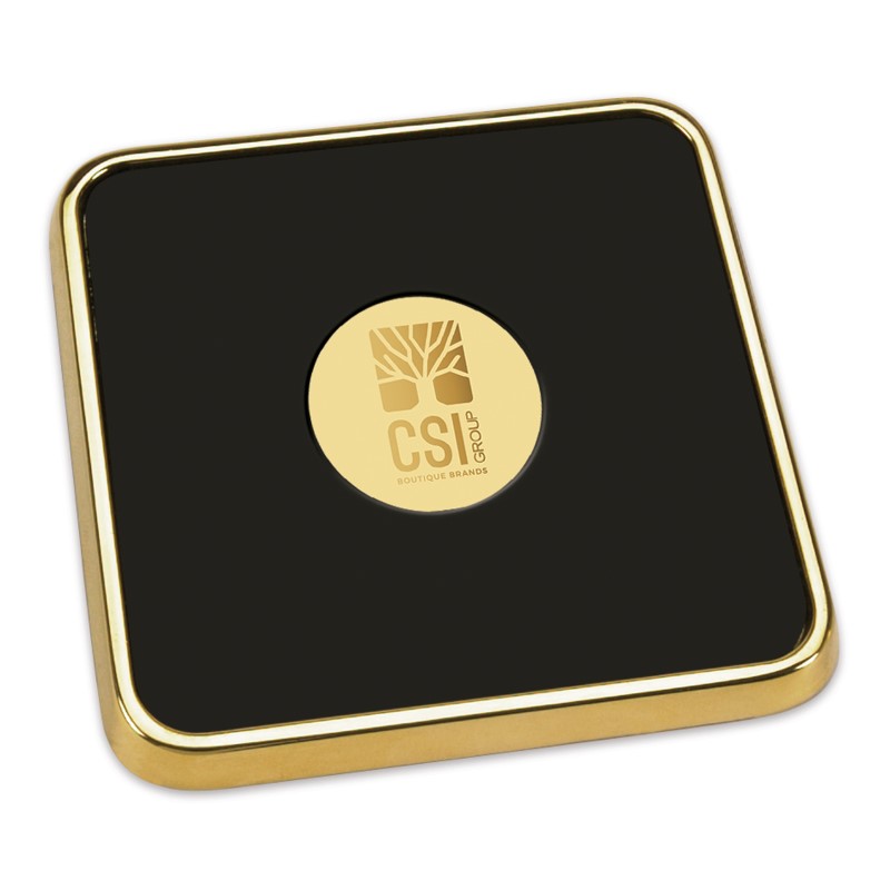 Enhance your corporate gifting with our Square Gold Tone Coaster. Featuring a polished gold-tone finish and durable leather surface, this coaster is perfect for custom branding. Each piece comes with a D3 Medallion, elegantly packaged in a pouch and gift box, ready for presentation. Ideal for showcasing your brand’s sophistication. 1″ H x 4.25″ W x 4.25″ L
